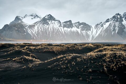 Der letzte Stopp unserer Reise war Stokksnes, eine atemberaubende Küstenlandschaft, die für ihre schwarzen Sanddünen und das majestätische Vestrahorn bekannt ist. Der schroffe Berg, der oft als eines der schönsten Fotomotive Islands gilt, spiegelt sich bei ruhigem Wetter perfekt in den Lagunen der Ebene.